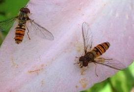 Episyrphus balteatus Helophilus trivittatusHover flies are in the Family of insects known as Syrphidae with just two wings like all the true flies, most other flying insects have four. The adults feed mainly on nectar and pollen, and can be seen among the flower borders hovering near to the blossoms. There are many species and some have striking markings resembling wasps, possibly to deter predators, but for some species to gain entry to their nests. As well as looking very similar to a wasp the adult hover fly can alter it's smell to fool them and enters the nest to lay eggs. After hatching the flat larva crawls down the side of the wasp larva in it's cell and eats it, moving on to another when finished, sometimes destroying the colony.